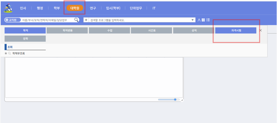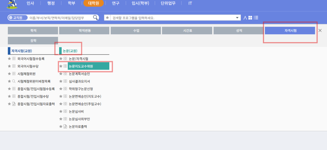 : 논문지도교수의 차세대포털시스템 → 종합정보  대학원 → 자격시험